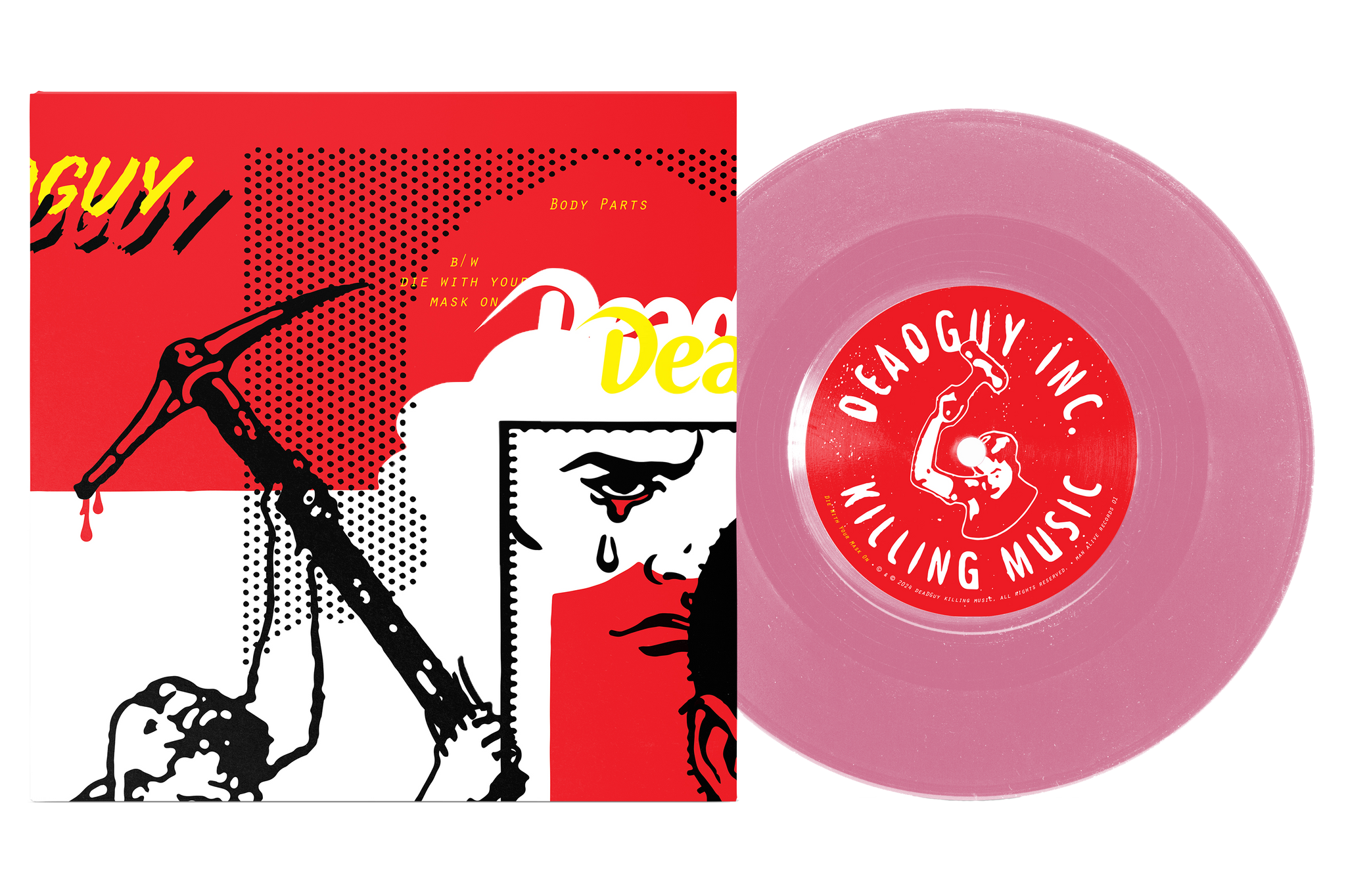 Backstory: DEADGUY recorded five songs with Steve Evetts at Trax East studios in February 1994, three of which were pressed onto the band’s first 7” single, “White Meat.” The other two tracks, “Body Parts” and an early version of their stand-out track “Die With Your Mask On,” sat on a cassette given to Tom Bejgrowicz by drummer Dave Rosenberg in the mid-90s and are only available on this 7”.